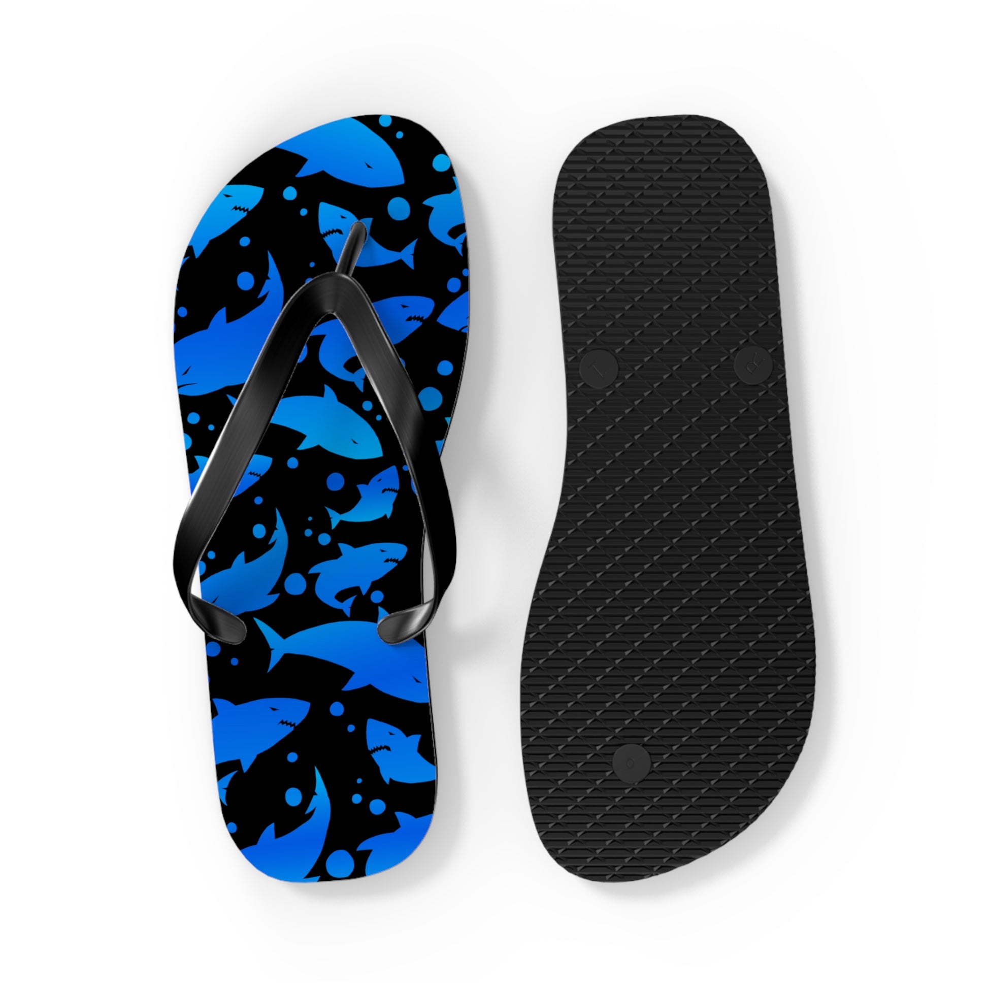 Feel the relaxing and carefree vibe of summer with these Ocean Blue Shark Flip Flops. Perfect for beach outings, vacations, and swimwear accessories. Ideal for those who love nautical themes and ocean-inspired designs. Great for summer holidays, trips to the beach, and casual wear.